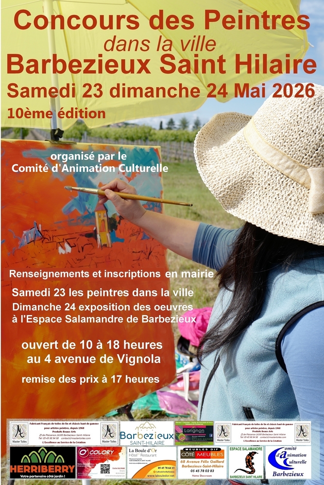 Concours de peintures, le samedi 23 mai après être passé à l’Espace Salamandre de Barbezieux pour valider vos toiles vous installez votre chevalet dans la ville. En fin de journée vous apportez vos réalisations à l’Espace Salamandre. Le dimanche matin 24 Mai un jury passe pour établir le classement des meilleurs réalisations. Les toiles sont exposées toute la journée (ouvert au public de 10 à 18 heures). A 17 heures Monsieur le Maire annoncera les résultats et les différents prix seront remis aux lauréats. à partir de 18h décrochage de oeuvres. (ventes possibles sur place des tableaux réalisés.