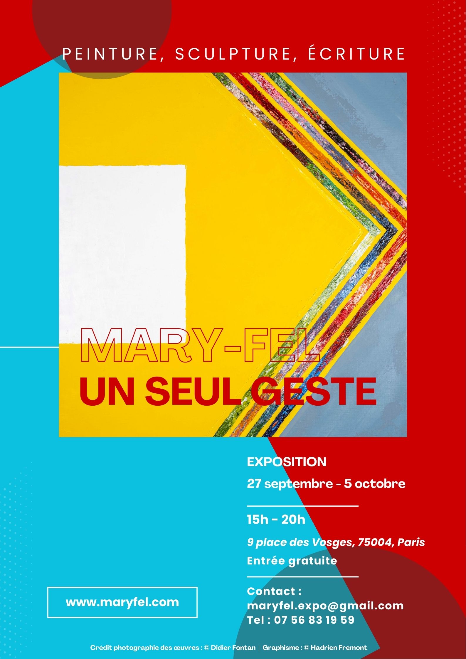 L’exposition « Un seul geste » présentera un ensemble de peintures, de sculptures et de textes de Mary-Fel dans le cadre d’un très bel immeuble du 17ème siècle donnant sur la cour d’honneur de l’Hôtel de Chaulnes, place des Vosges.