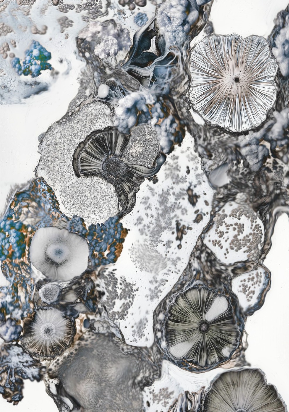 En nous plongeant dans un projet qui cherche à brouiller les repères de la réalité, Sandrine Elberg confond les échelles entre l’infiniment grand et l’infiniment petit, nous permettant d’explorer les confins du cosmos dans des paysages extraterrestres à la frontière du réel et de l’imaginaire. Au bord de la mer, Julien Mignot synthétise toutes les couleurs et les événements invisibles d’une même journée afin de chercher à capturer son essence ; les variations colorées du ciel et de l’océan nous emmènent aux limites de l’abstraction et nous invitent donc à une réflexion sur notre place dans le monde.