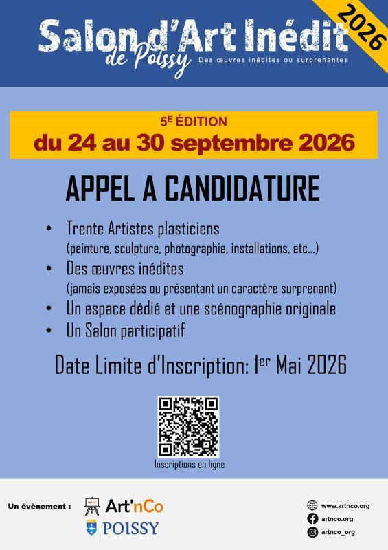 Mai 1 Toute la journée Appel à Artistes – Salon d’Art Inédit de Poissy 2026 Centre de Diffusion Artistique – Poissy 53 Avenue Blanche de Castille, 78300 Poissy Détails des Évènement Recevoir l’Itinéraire à suivre