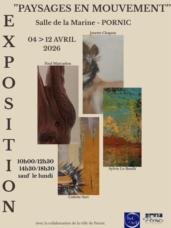 Avr 4 4 avril 2026 @ 10 h 00 - 12 avril 2026 @ 18 h 30 Exposition de peintures et sculptures : Paysages en mouvement Salle de la Marine rue de la marine, 44210 Pornic Détails des Évènement Recevoir l’Itinéraire à suivre