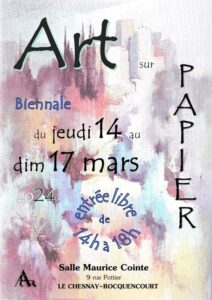 La deuxième édition de la Biennale d'Art sur Papier du Chesnay-Rocquencourt, organisée par l'ACCR, réunira vingt artistes aux techniques variées : aquarelle, art digital, calligraphie abstraite, dessin, gravure, pastel, photo etc... Entrée libre Salle Maurice Cointe, de 14h à 18h.